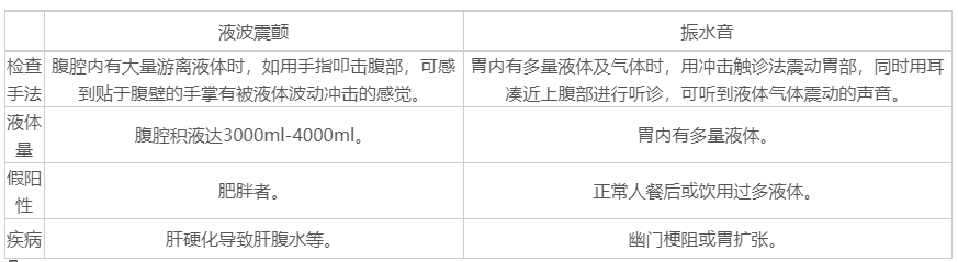 液波震颤和振水音均为腹部触诊的诊察体征,两者均因游离液体或气体而产生,但是两者的游离液体所在的位置截然不同,所对应的临床疾病也截然不同。且两者在临床诊察中,不然各自均易出现假阳性体征,还容易互相混淆,因此在临床诊察以及考试时需要明确各自的定义,并能够将诊察结果相区别。