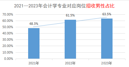 在2021年时,会计学专业对应岗位招收的男性占比在50%左右,在22年和23年上涨到了60%以上,且还有增加的趋势。