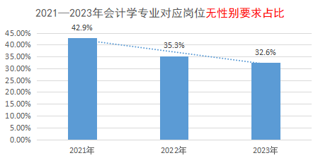 2021—2023年会计学专业对应岗位标明的无性别要求占比是在逐年下降的,从40%降到了30%,所以从大环境来看,军队文职会有越来越多的岗位有性别限制。
