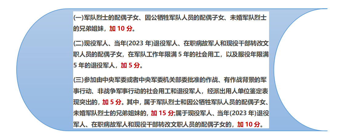 ”军队烈士和因公牺牲军队人员的配偶子女、未婚军队烈士的兄弟姐妹,现役军人、2023年退役军人、在职病故军人和现役干部转改文职人员的配偶子女,在军队工作年限满5年的社会用工、服役年限满5年的退役军人,以及参加由中央军委或者中央军委机关部委批准的作战、有作战背景的军事行动、非战争军事行动的社会用工和退役军人,通过报名资格条件审核且取得全军统一笔试有效成绩的,享受公共科目加分优待政策。“