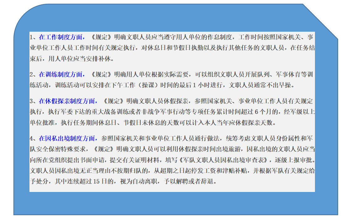 根据军队特殊要求和文职人员身份特点,对涉及文职人员切身利益的具体事项进行了科学合理、更为人性化的规范。
