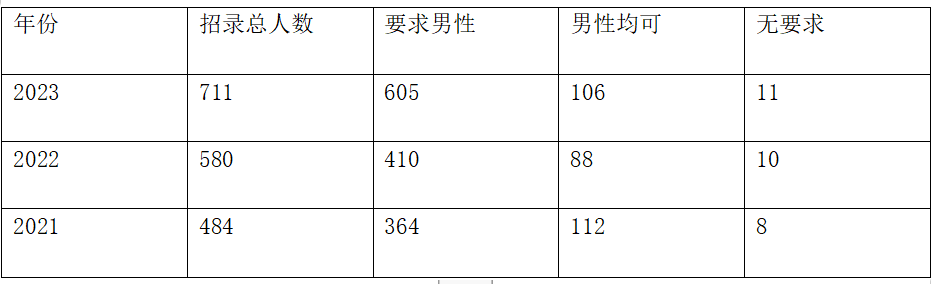 可以看到,2023年汉语言文学专业招录总人数711人,其中明确要求男性的岗位就招录605人,占总招录人数的85%;2022年汉语言文学专业招录人数在580人,其中明确要求男性的岗位就招录410人,占总招录人数的70%;2021人招汉语言文学专业招录人数在484人,其中明确要求男性的岗位就占总人数的75%。