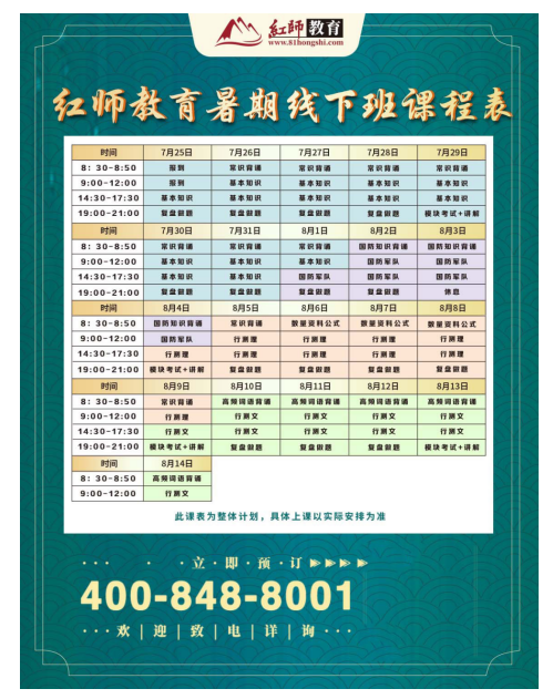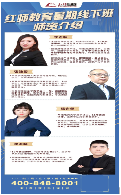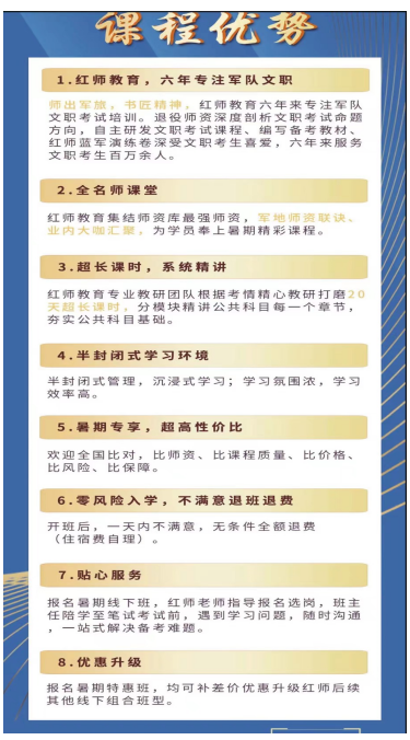红师教育由退役军人创办,专门从事文职的招考培训。他们秉承“身正为红、学高为师”的校训,以军事文化的厚重和军事化管理的严格,对希望迈入军营、成为军队文职人员的莘莘学子提供一对一的服务。已经帮助诸多学子上岸军队文职。