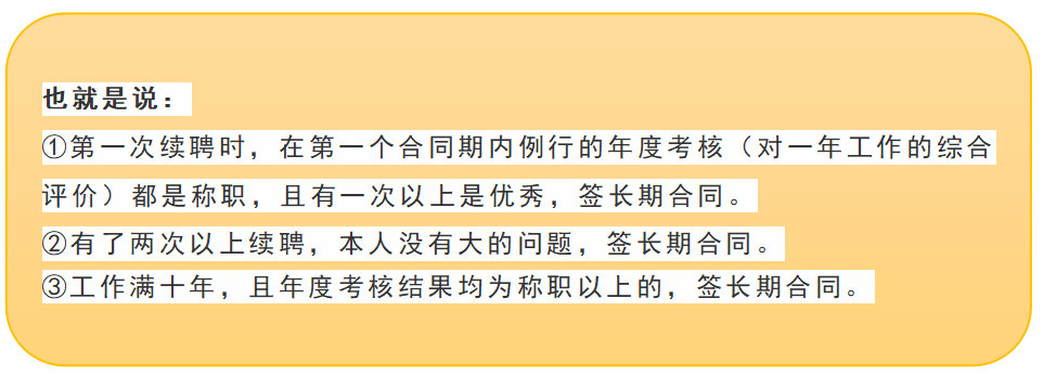 《军队文职人员管理规定》明确:续聘的文职人员合同期内年度考核结果均为称职以上且有一次以上为优秀,或者属于两次以上续聘,本人要求续订本级岗位最长合同期限的聘用合同的,聘用单位应当与其续订本级岗位最长合同期限的聘用合同。