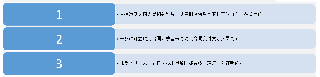 《军队文职人员聘用合同管理暂行规定》明确指出,用人单位有下列情形之一,给文职人员造成损害的,应当承担赔偿责任: