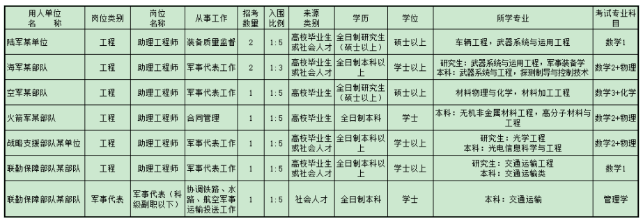 在往年招聘中,军队文职招考岗位计划表中显示,各军兵种均编制有军代表岗位并向社会公开招聘。其中,陆军、海军、空军、火箭军和战略支援部队招聘的是驻工厂军事代表,联勤保障部队招聘的除驻工厂军事代表外,也招聘驻交通运输部门军事代表。