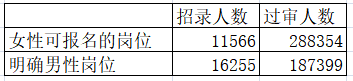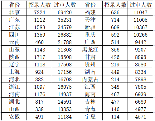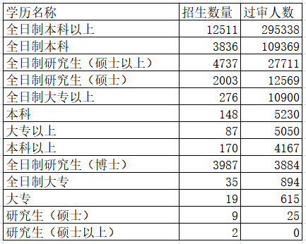 从上图我们可以看到,本科生过审人数比较多,招聘人数也比较多,而且过审人数要比招聘人数多很多;而到了硕士研究生,招聘的岗位没有本科生那么多,报考人数也没有比较少了,招聘人数和过审人数的差距也没有本科生那么大了;而到了博士研究生,招聘人数比过审人数还要多。