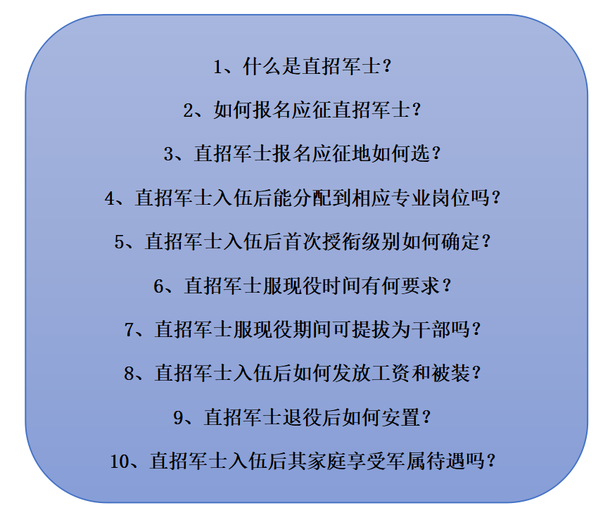 直接从非军事部门招收军士(简称直招军士),是指根据《兵役法》、《征兵工作条例》以及有关规定,直接招收普通高等学校的毕业生入伍,作为志愿兵役制士兵到部队服现役。直招军士的招收对象为全日制大专以上学历,未婚,所学专业与部队需求专业相同的男性大学生。招收时间从每年8月份开始,9月底结束。