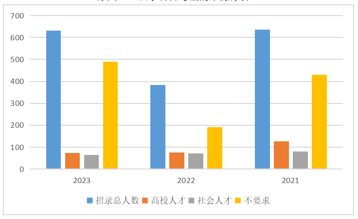 可以看到,2021年到2023年法学科目招录考生来源,高校人才招录人数还是较社会人才招录人数多!虽然不做要求的人数占大多数,但是根据小编上篇《军队文职【法学科目】解读:备考该科目考生要求党员岗位占一半?还有其他条件要求吗?》文章分析,这些考生来源中对考生的学历和相应的专业能力都有着较高的要求。