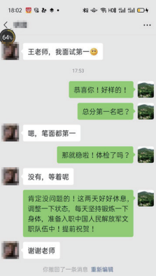 “感谢红师教育,感谢老师的辛勤付出!在我报考军队文职的人生旅程上,您丰富了我的心灵,开发了我的 智力,为我点燃了希望的光芒,谢谢您了,老师!”