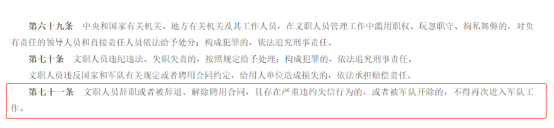 《中国人民解放军文职人员条例》第七十一条规定:文职人员辞职或者被辞退、解除聘用合同,且存在严重违约失信行为的,或者被军队开除的,不得再次进入军队工作。