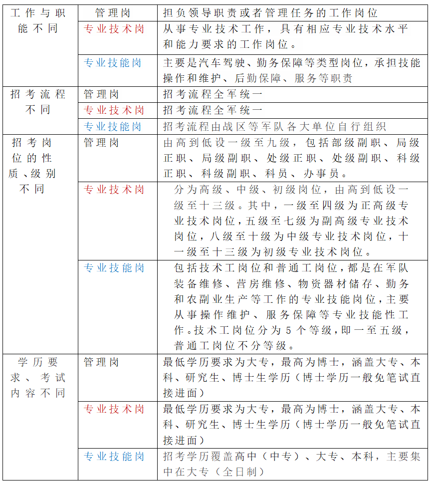 军队文职岗位有三大类:管理岗、专业技术岗、专业技能岗。