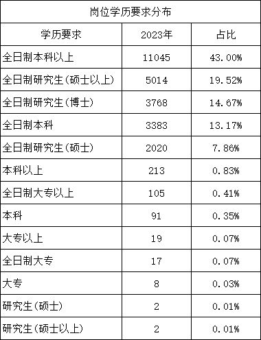 高学历的优势就比较大量,985/211重点大学的优先,研究生、博士生也是优先考虑的。其中硕士及博士的要求占比达到了42.1%。所以各位高学历的朋友们,这一要求瞬间给你解决了大部分的竞争对手,可以放心选择了。不过对本科学士学位人才的需求量是最大的,在57.4%左右。从去年的数据看来专科只有149个岗位可报考。所以专科也是可以报,但是可选择的岗位有限。