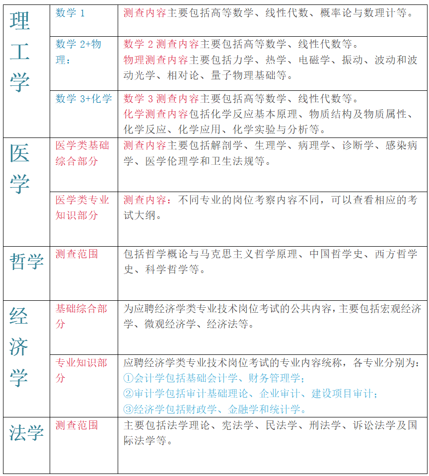 军队文职专业考试科目包括管理岗位专业科目考试大纲和43个专业技术岗位专业科目,按照理工学、医学、哲学、经济学、法学、教育学、文学、历史学、图书档案学、外国语言文学、农学和艺术学等12个学科门类相应设置专业科目,主要测查专业素质和能力。