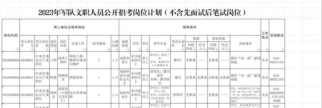 除了以上内容,该文章还提供了2023年军队文职岗位分布的情况。通过对往年岗位的分析,我们可以了解到各个岗位的竞争程度和报考数量。这对于考生来说是一个重要的参考依据,可以帮助他们更好地制定自己的报考策略。