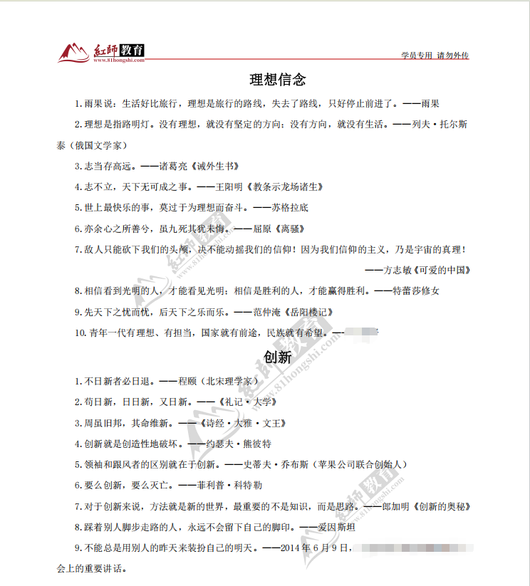1.雨果说:生活好比旅行,理想是旅行的路线,失去了路线,只好停止前进了。一一雨果2.理想是指路明灯。没有理想,就没有坚定的方向:没有方向,就没有生活。--列夫.托尔斯(俄国文学家)