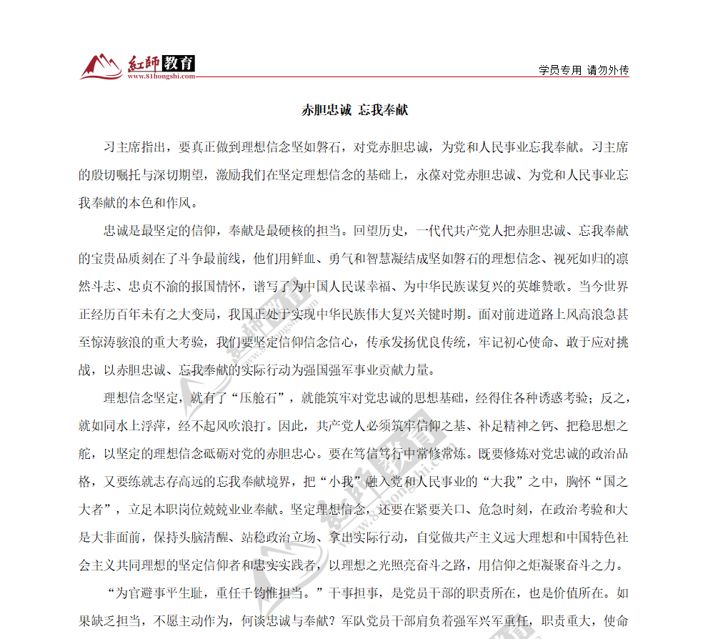 习主席指出,要真正做到理想信念坚如磐石,对党赤胆忠诚,为党和人民事业忘我奉献。习主席的殷切嘱托与深切期望,激励我们在坚定理想信念的基础上,永葆对党赤胆忠诚、为党和人民事业忘我奉献的本色和作风。