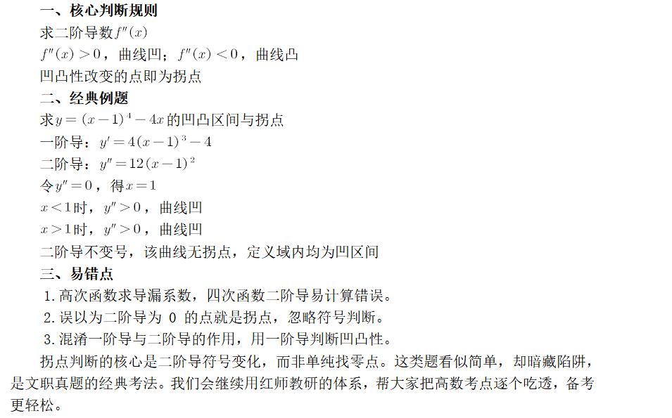 军队文职数学 1 高数占 40–50 分,导数几何应用是高频板块,凹凸性与拐点常和单调性、极值综合考查。红师教研整理历年真题发现:高次函数的凹凸性判断是近年热门考点,只要掌握二阶导计算技巧,就能稳稳得分。