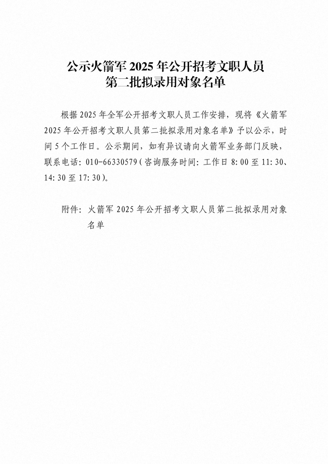 原文标题:公示火箭军2025年公开招考文职人员第二批拟录用对象名单