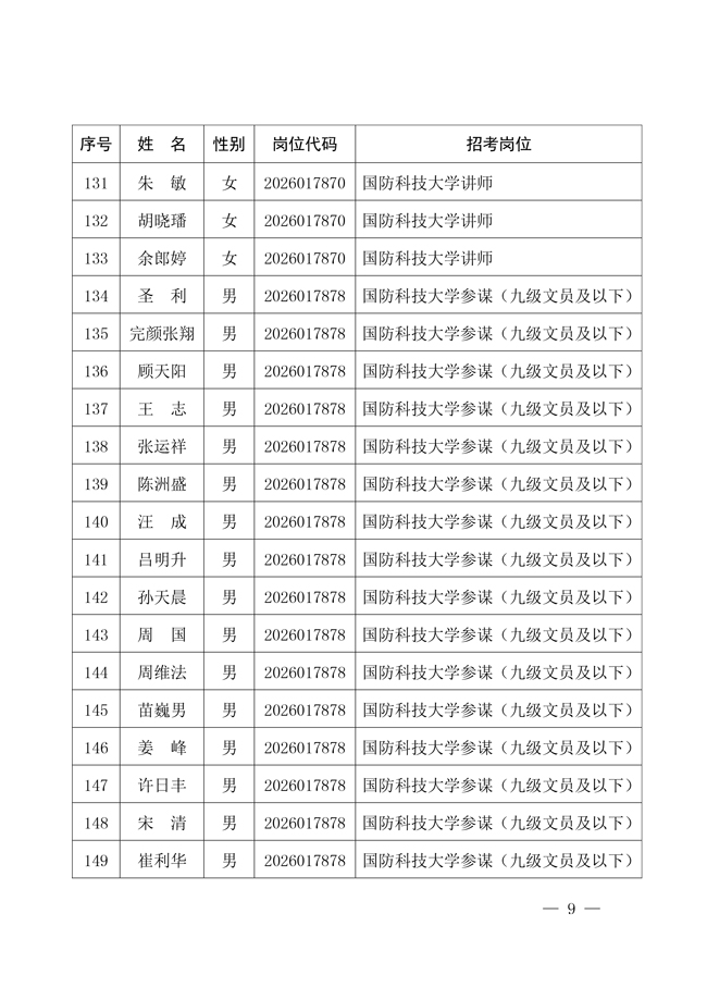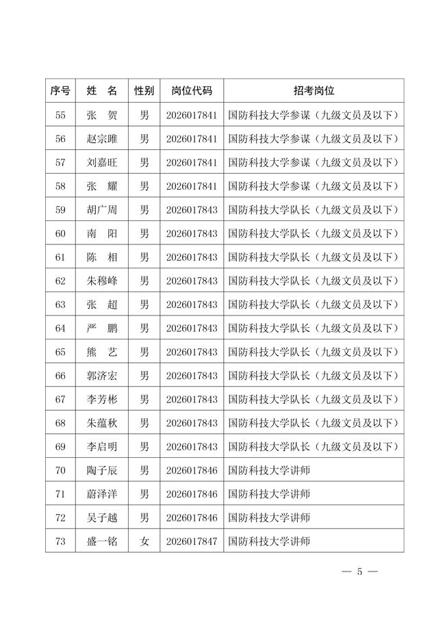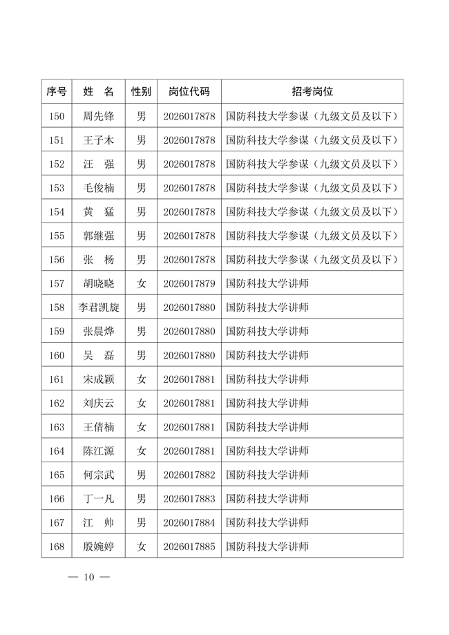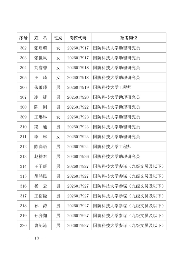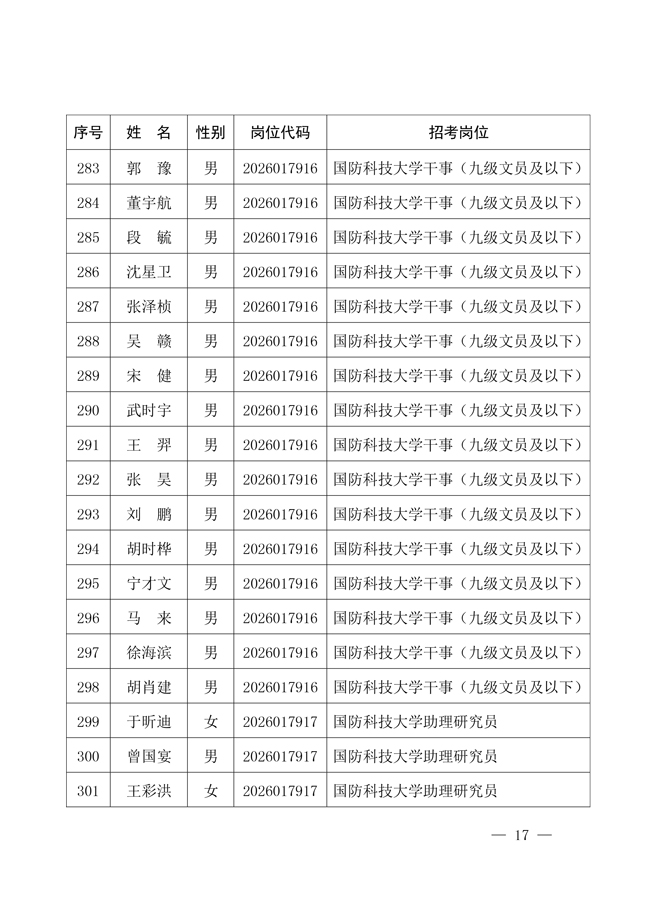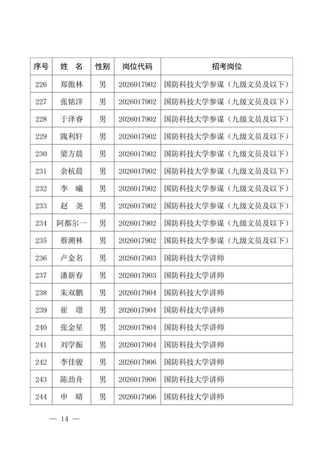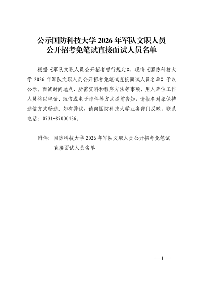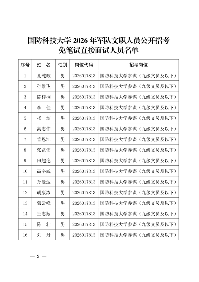 原文标题:公示国防科技大学2026年军队文职人员公开招考免笔试直接面试人员名单