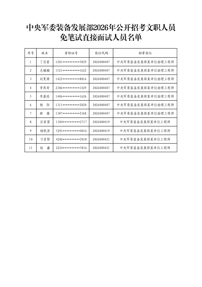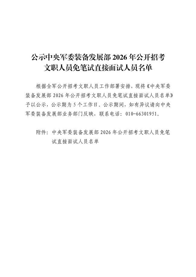 原文标题:公示中央军委装备发展部2026年公开招考文职人员免笔试直接面试人员名单