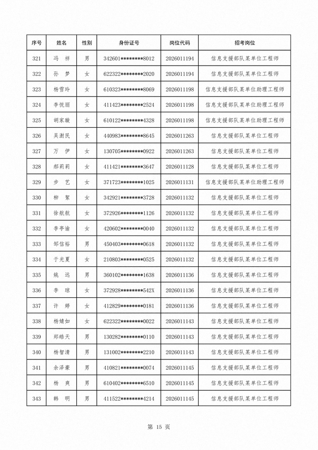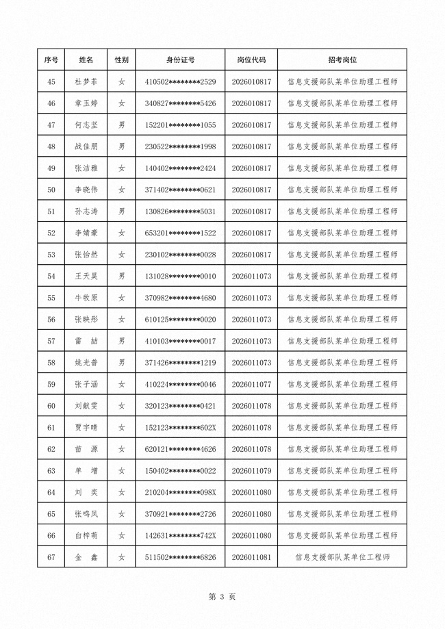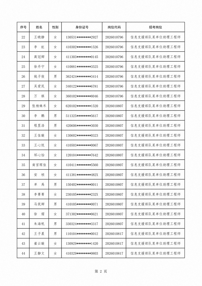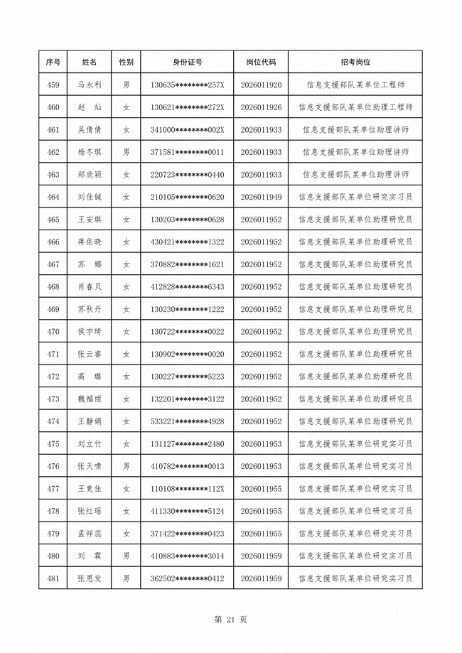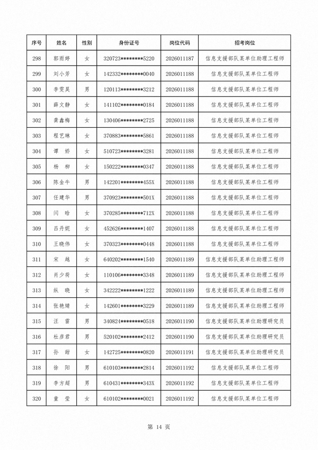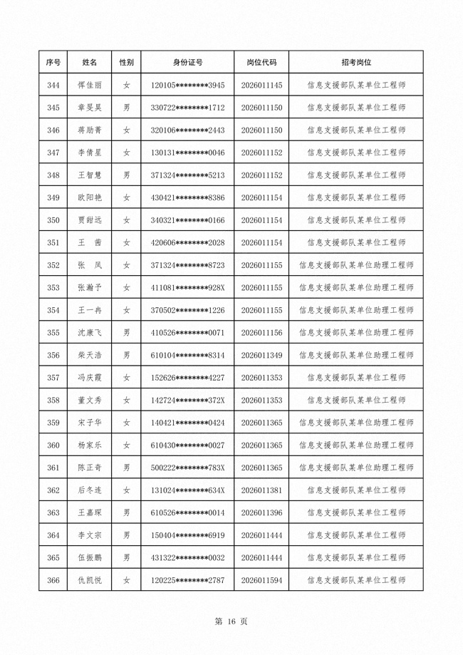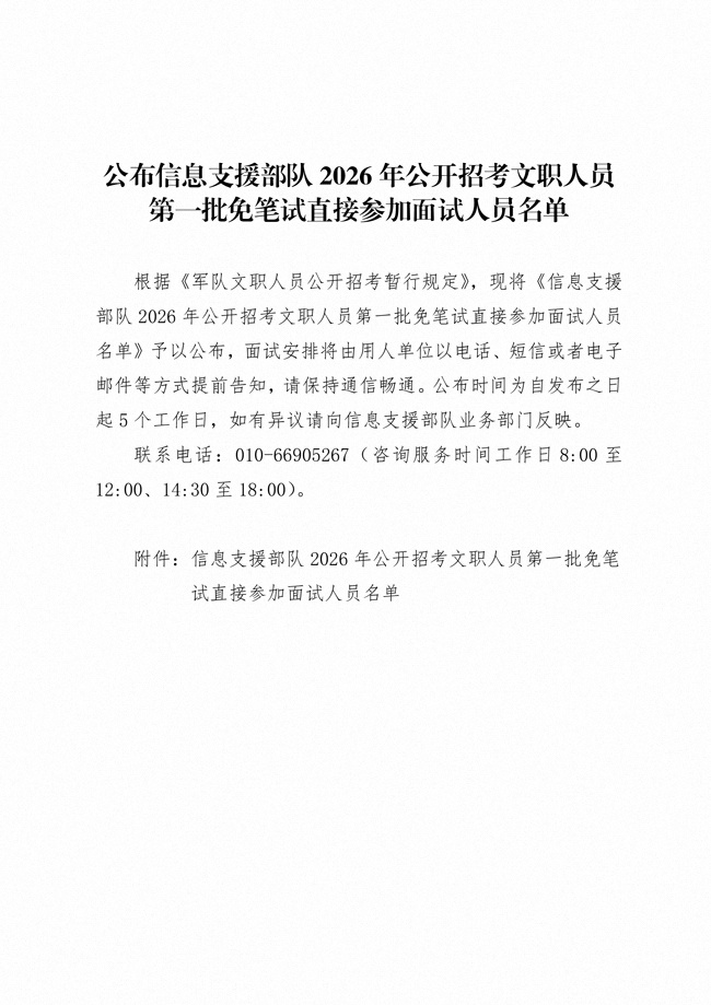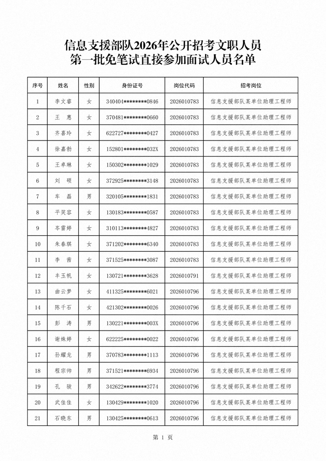 原文标题:公布信息支援部队2026年公开招考文职人员 第一批免笔试直接参加面试人员名单