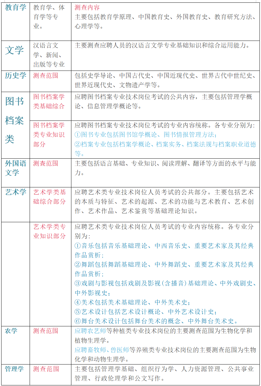 军队文职专业考试科目包括管理岗位专业科目考试大纲和43个专业技术岗位专业科目,按照理工学、医学、哲学、经济学、法学、教育学、文学、历史学、图书档案学、外国语言文学、农学和艺术学等12个学科门类相应设置专业科目,主要测查专业素质和能力。